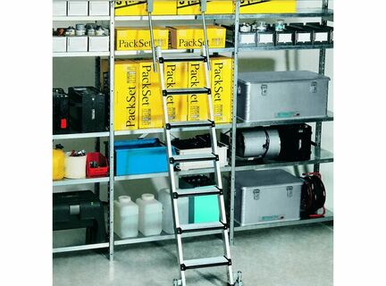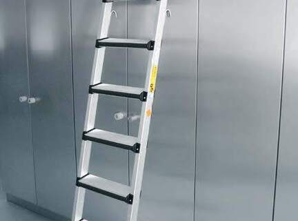 - В нерабочем положении можно компактно прислонить лестницу к стеллажу.
