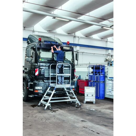Подъём и спуск с двух сторон, возможность работать, стоя на ступенях, высокая мобильность и хорошая устойчивость благодаря четырём подпружиненным роликам.